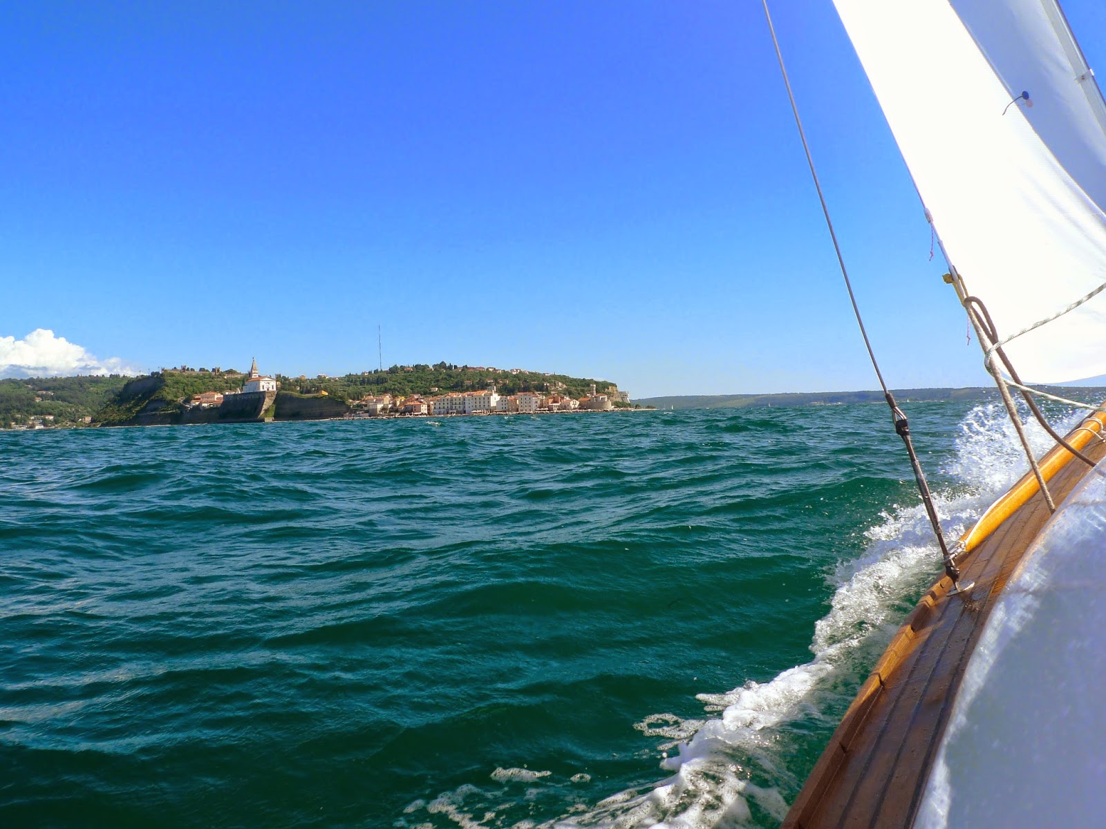 Heute waren wir zum ersten Mal die neuen Segel einweihen! Bei angenehmen 10 bis 15 Knoten Wind hieß es Leinen los. Für einen kleinen Ausflug kreuzten wir ins benachbarte Piran, um in der wunderschönen Altstadt einen Kaffee zu genießen und dann auf gemütlichem Raumkurs wieder zurück nach Izola zu segeln.
